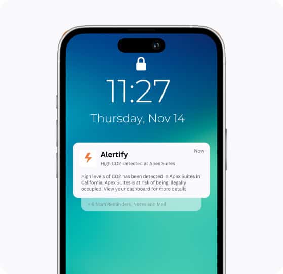 Prenez le contrôle de votre environnement intérieur grâce à la surveillance par IA d'Alertify. Suivez la température, l'humidité, le CO2, la qualité de l'air et les risques de moisissures dans tous les logements pour une expérience client plus saine et plus économe en énergie. Recevez des alertes instantanées en cas de changement de température, consultez les informations sur les risques de moisissures dans votre tableau de bord et surveillez les niveaux de CO2 pour assurer une ventilation adéquate et préserver la qualité de l'air.